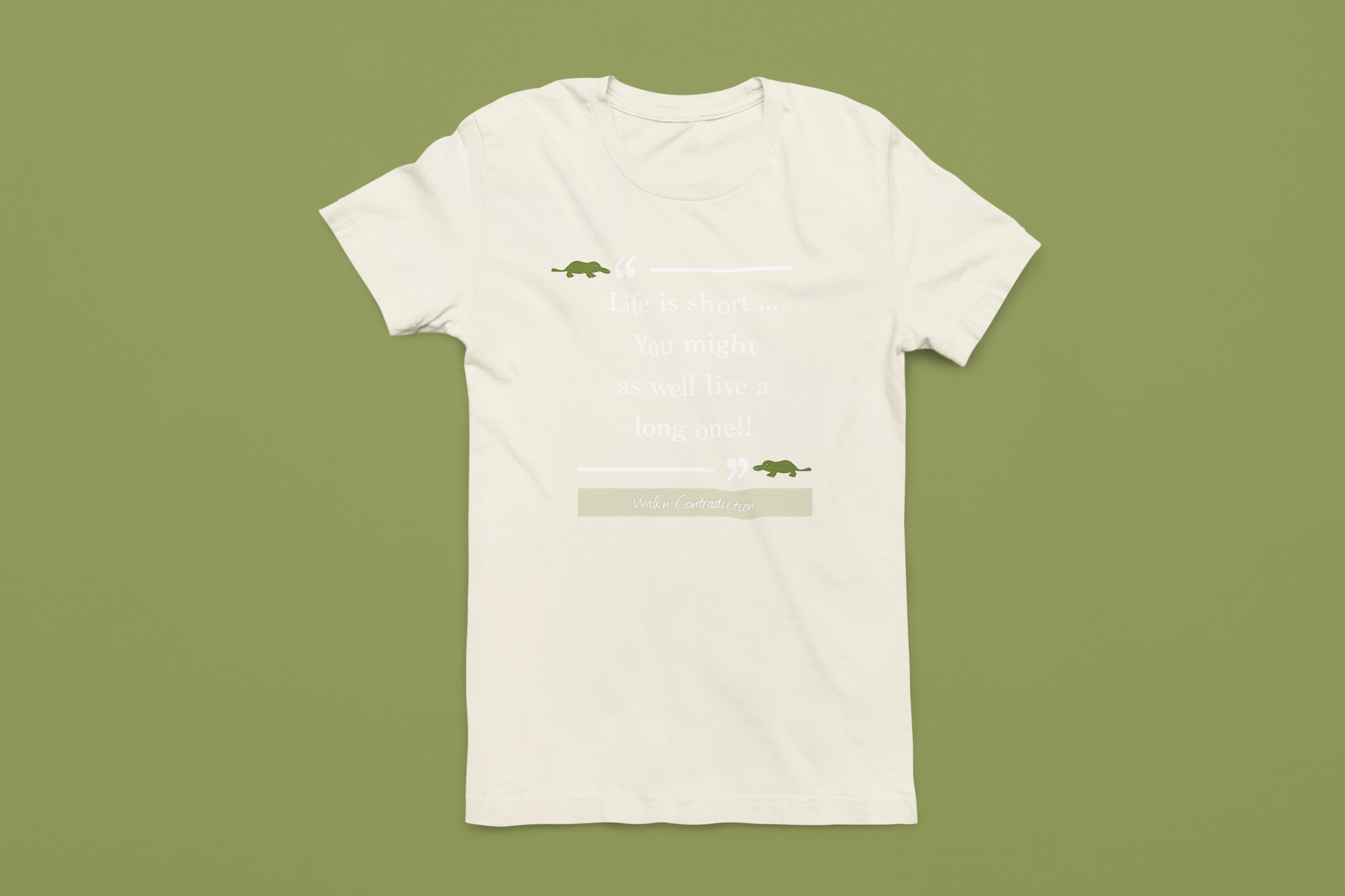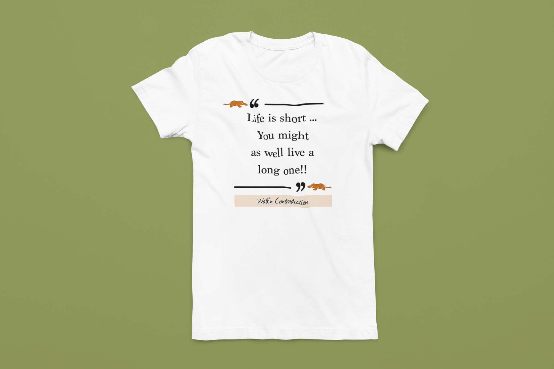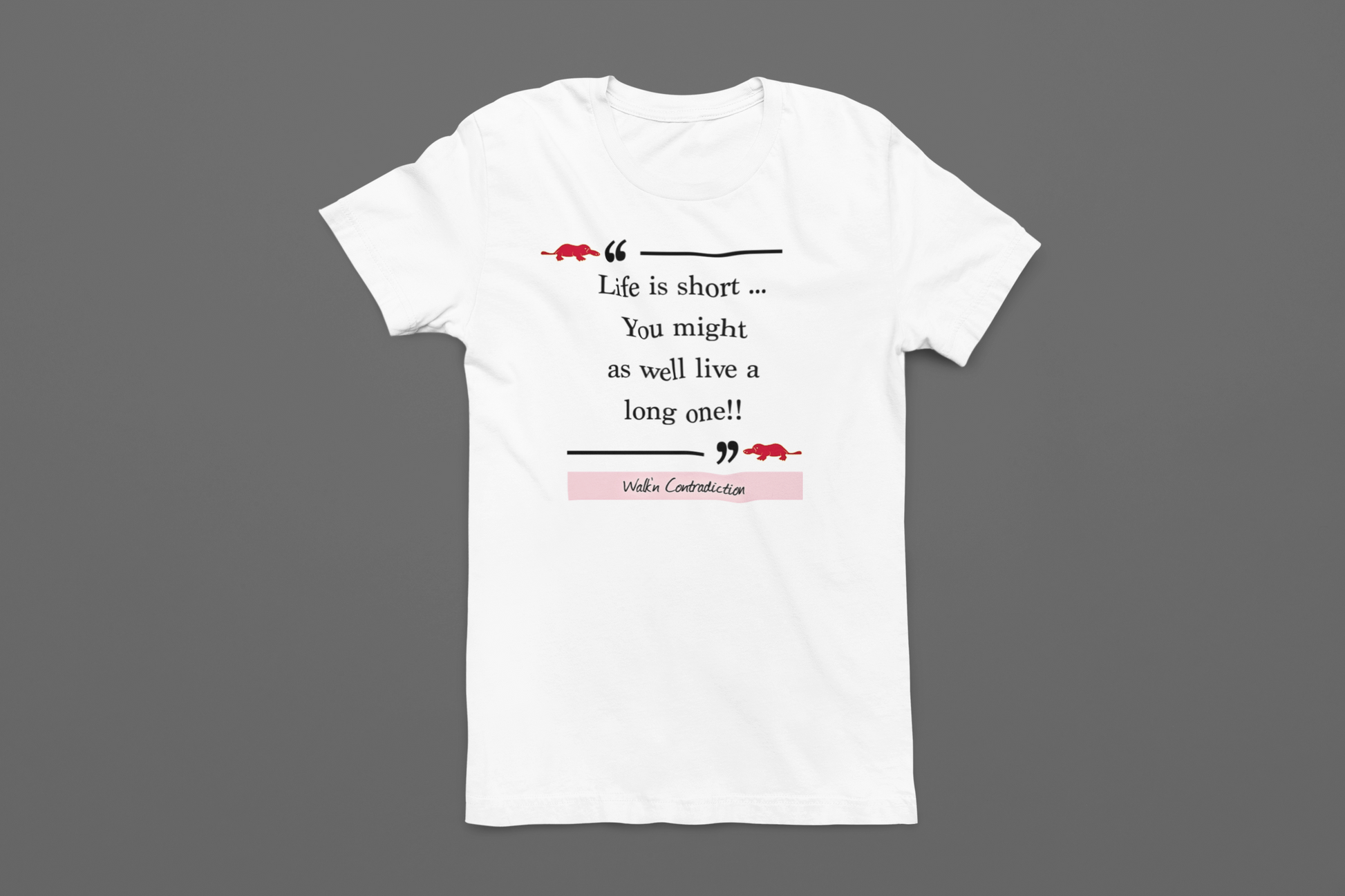 Super soft , lightweight and pre- shrunken unisex t. Made with 100% Airlume combed and ring-spun cotton, with "Life is short.. You might as well live a long one!!" quoted on the front with platypus bookends.